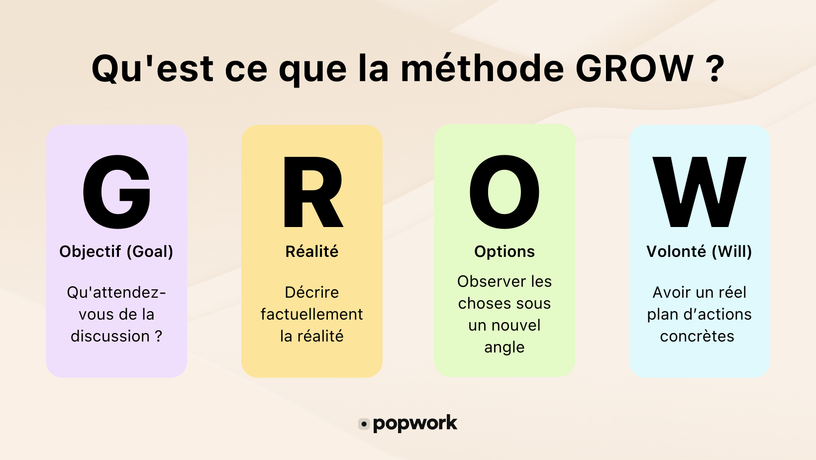 En matière de coaching, là aussi, n'improvisez pas et appuyez-vous sur des méthodes qui ont déjà fait leur preuve comme le modèle GROW et ses quatre étapes :