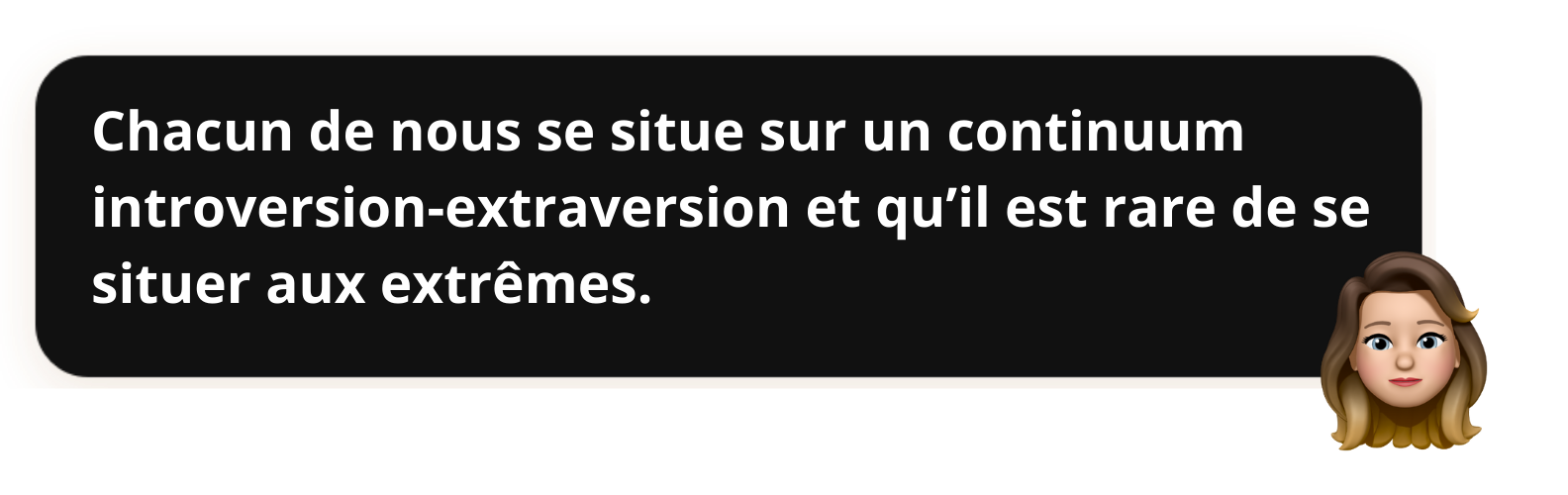 Ce qui est important à comprendre, c’est que chacun de nous se situe sur un continuum introversion-extraversion et qu’il est rare de se situer aux extrêmes. Si notre tempérament est relativement figé sur un point du continuum et qu’il n’est pas élastique à l’infini, nous avons tous la capacité de nous y déplacer selon le contexte et l’enjeu. Chacun peut donc adopter des comportements et des compétences du profil opposé avec un peu d’entraînement. Il est très enrichissant de faire collaborer différents types de profils entre eux, et les rendre complémentaires pour l’équipe ou l’entreprise.