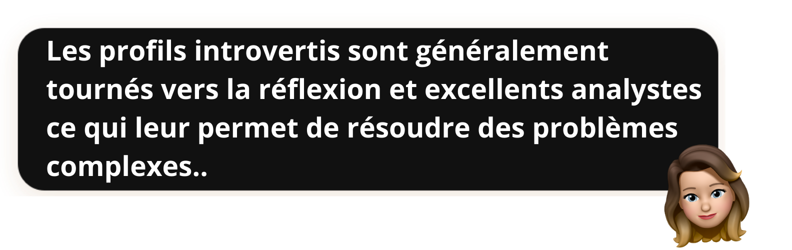 Les profils introvertis sont généralement tournés vers la réflexion et excellents analystes, ce qui leur permet de résoudre des problèmes complexes. Leur capacité de concentration est également un atout pour travailler sur des sujets de fond, qui demandent persévérance, rigueur et sens du détail. Ils peuvent aussi s’avérer très créatifs et innovants lorsqu’ils sont dans un environnement de confiance, adapté à leur fonctionnement.