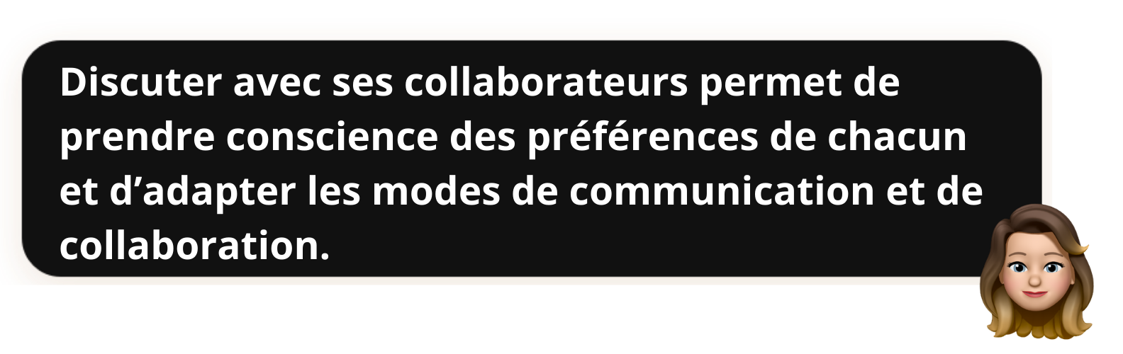 La première étape est d'être capable de lire les comportements et de bien cerner les profils de ses collaborateurs, et d’en discuter avec eux si nécessaire. Cela permet de prendre conscience des préférences de chacun et d’adapter en fonction ses modes de communication et de collaboration. C’est aussi une clé pour attribuer à chacun des missions adaptées à ses zones d’excellence.