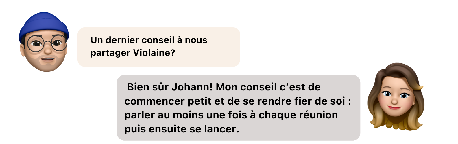 Mon conseil c’est de commencer petit et de se rendre fier de soi : parler au moins une fois à chaque réunion puis ensuite se lancer - avec préparation ou en prenant des notes à l’écrit avant de s’exprimer - pour défendre une idée à laquelle on croit en session de groupe… Cette mécanique de petits pas permet vraiment de monter en puissance sans se dénaturer, pour le bénéfice de tous !